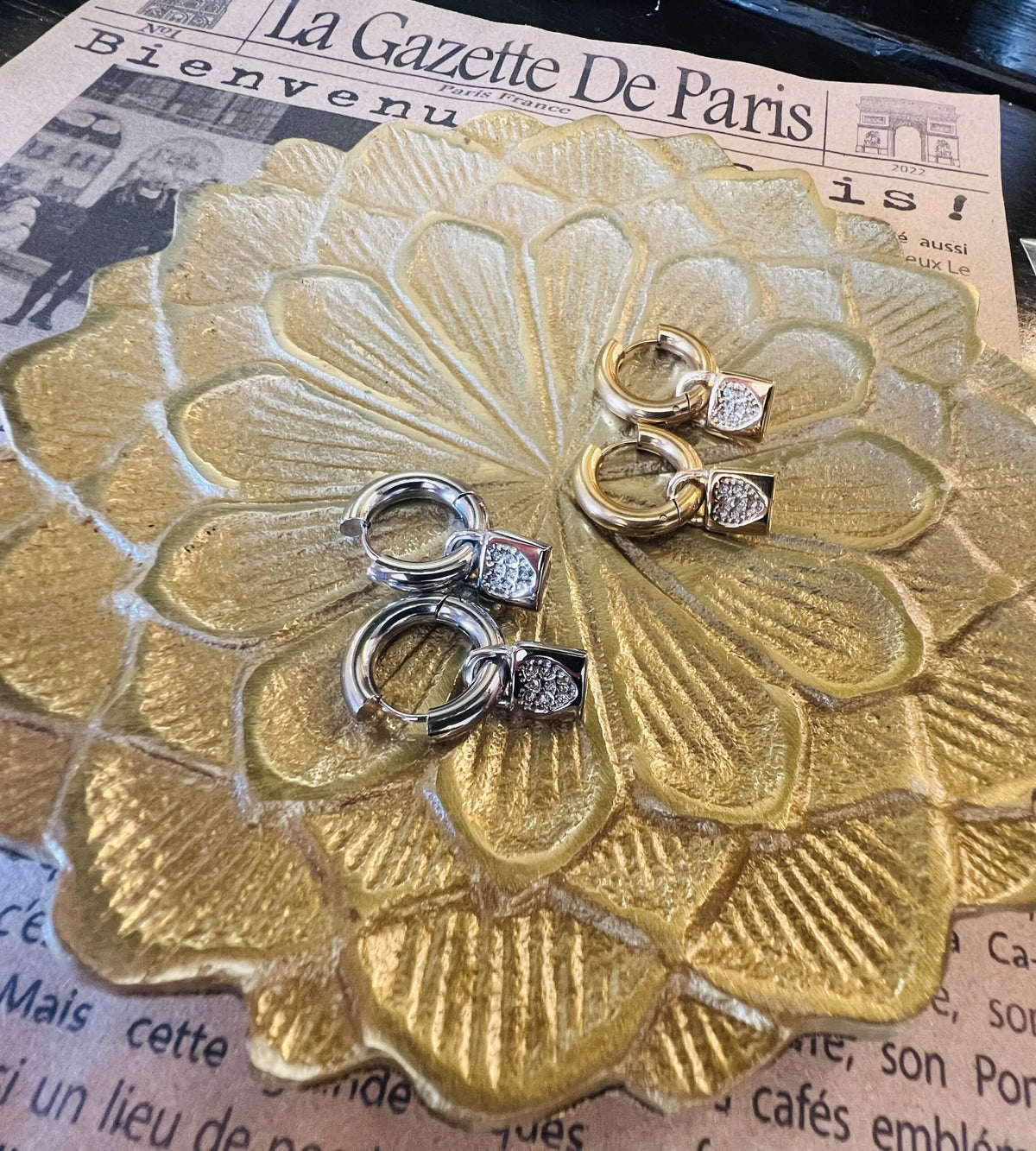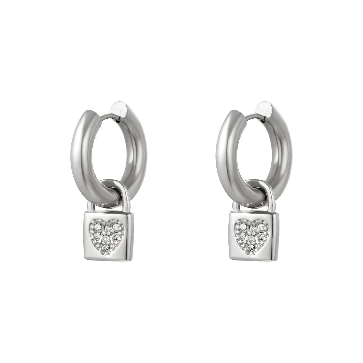 Roestvrij staal creolen met slot bedel met hart met strass-steentjes.