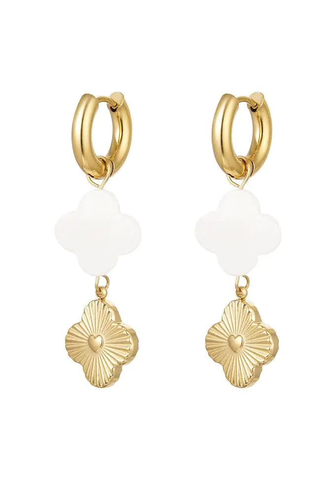 Wauw hoe tof zijn deze statement oorbellen! in de vorm van een klaver in het goud met wit.