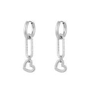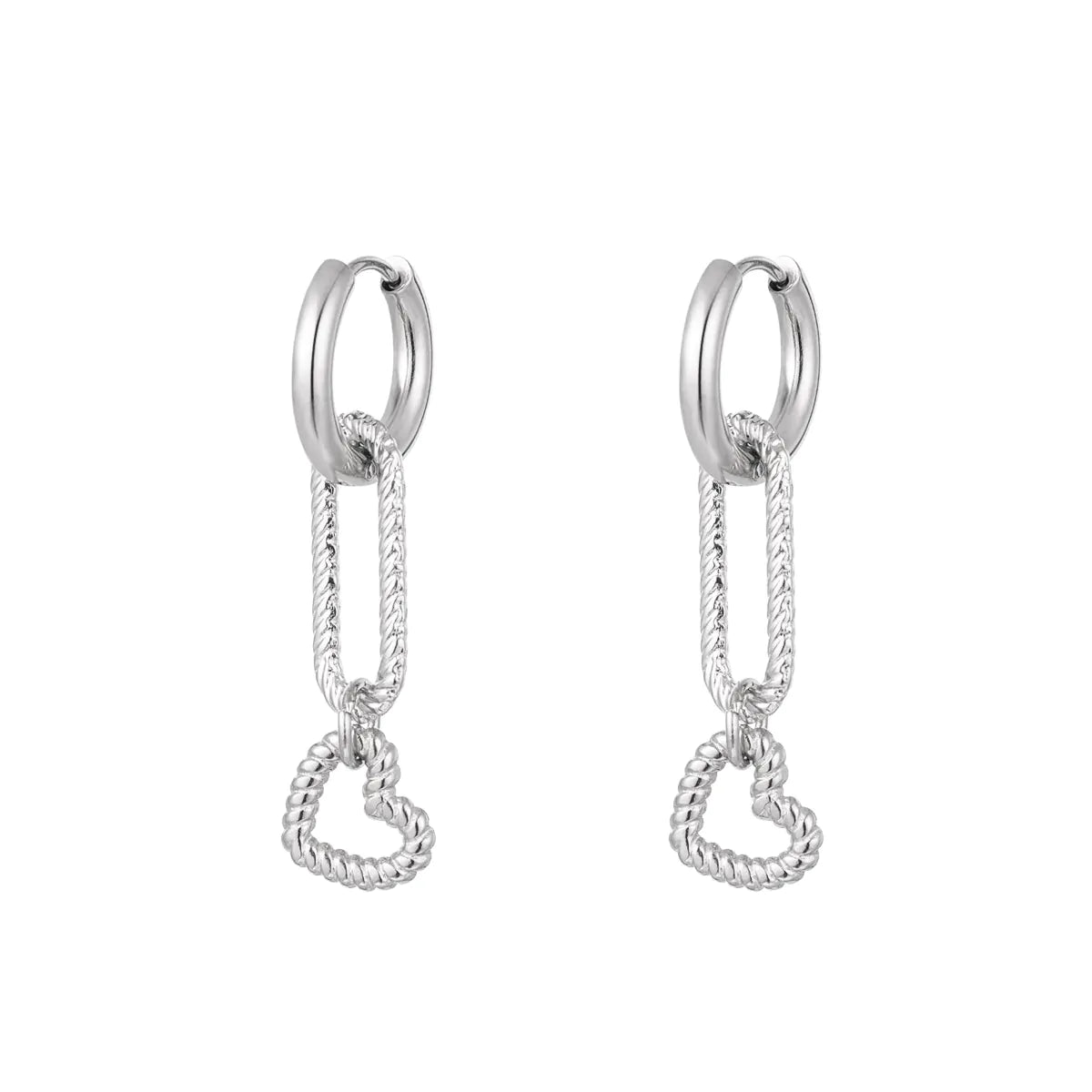 Mooie stainless steel oorbellen in de kleur zilver met een grote schakelbedel en een klein hartje met gedraaide structuur.